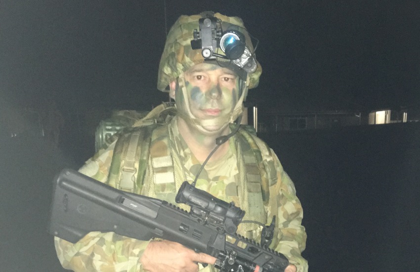 Because for more than a decade he has been living a double life: accountant during the day at his practice in Robina on the Gold Coast, but at other times – and in spirit all the time – an infantryman, Lance Corporal in the 25th/49th Battalion, Royal Queensland Regiment, Army Reserve.