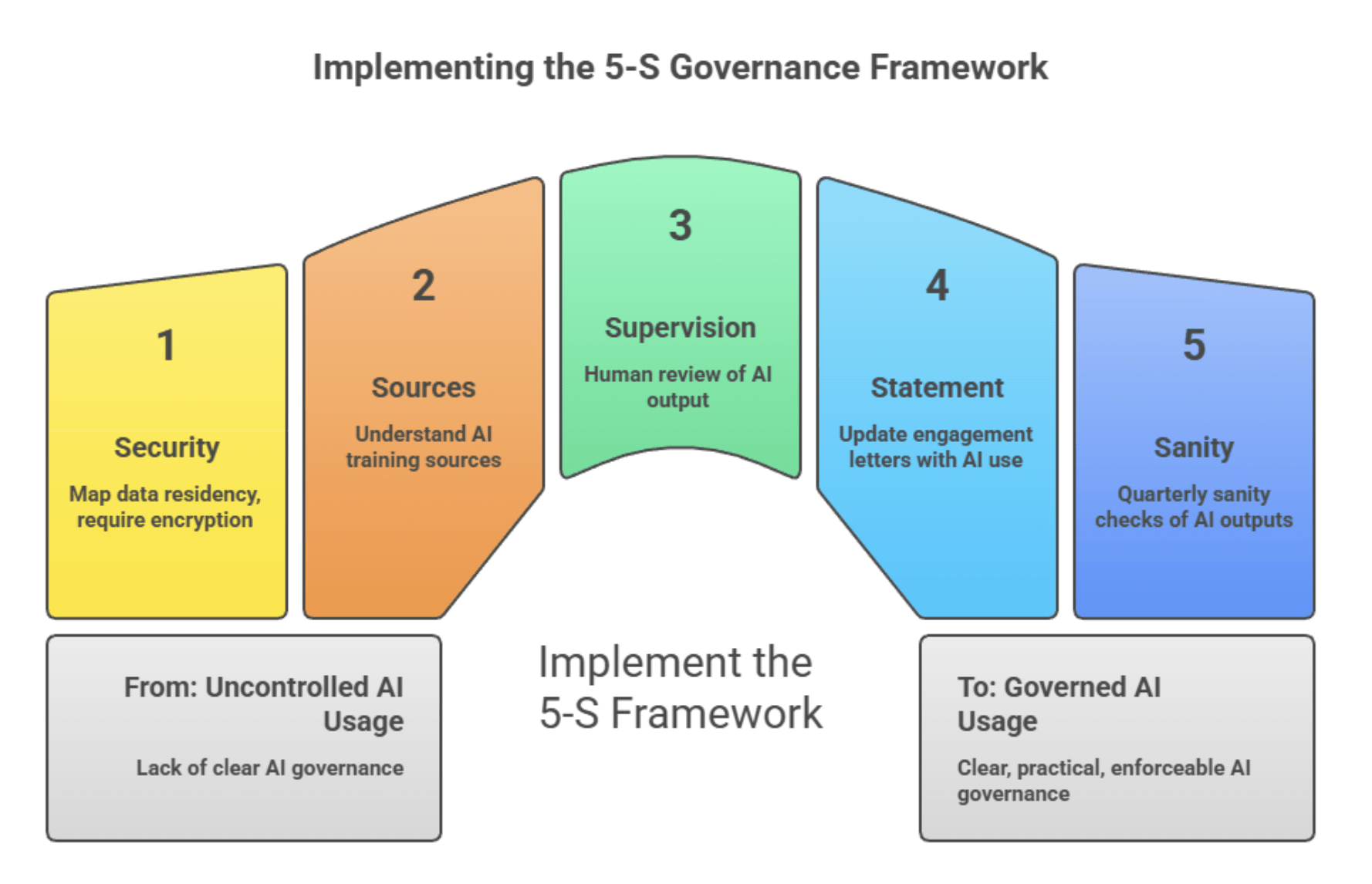 Reality: IT policies govern software procurement and data security – they don't address who's responsible when AI produces incorrect advice, what disclosure clients receive, or how you verify outputs before they become the firm's outputs. These aren't IT questions. They're governance questions. Most firms haven't answered them.